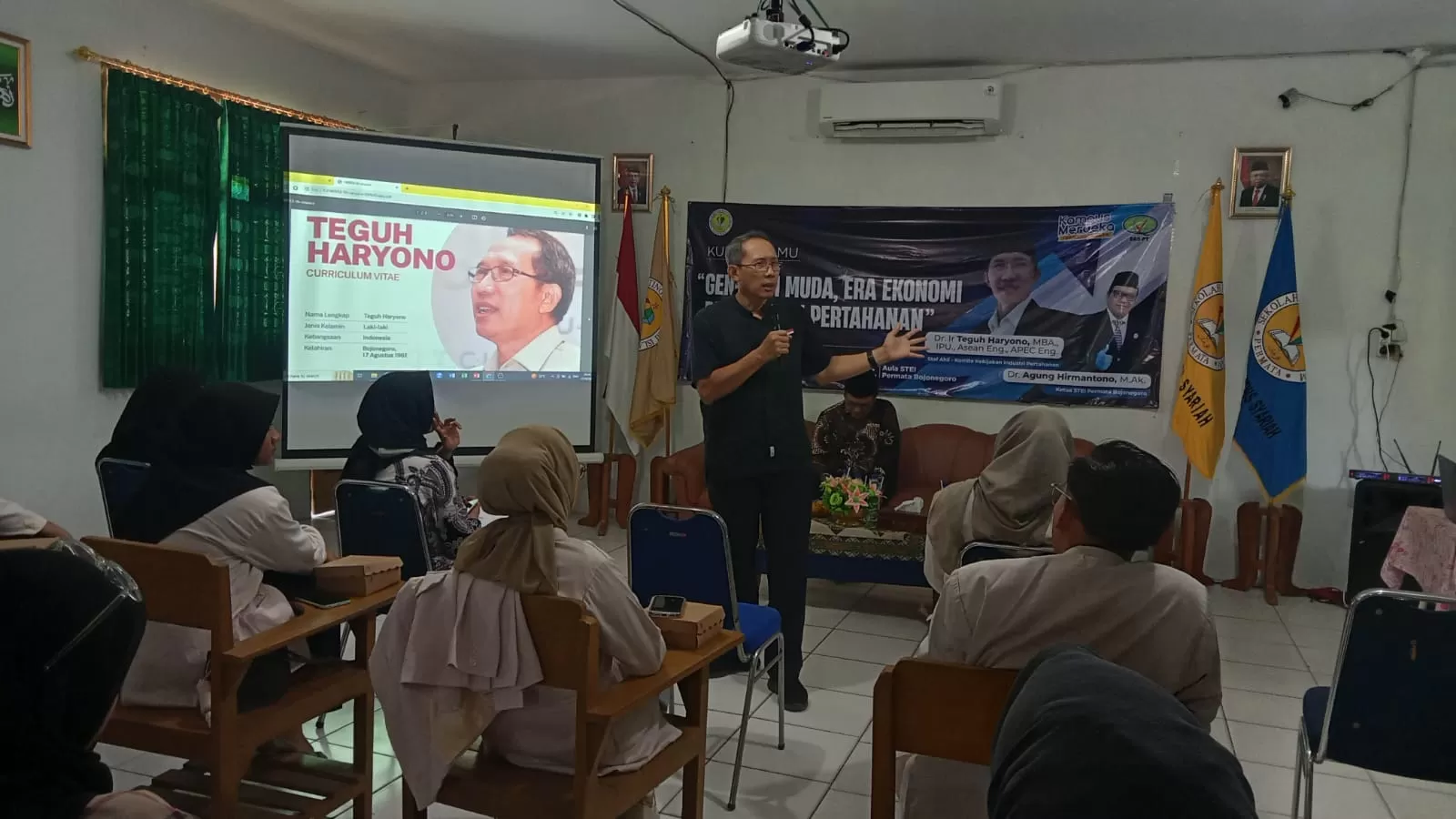 Bojonegoro, 21 Oktober 2023 — Sekolah Tinggi Ekonomi Islam (STEI) Permata Bojonegoro menggelar kuliah tamu bertema “Generasi Muda, Era Ekonomi Digital dan Pertahanan” pada Sabtu, 21 Oktober 2023 bertempat di Aula STEI Permata Bojonegoro. Acara ini menghadirkan dua narasumber berpengaruh di bidang akademik dan kebijakan industri pertahanan, yakni Dr. Agung Hirmantono, SE., M.Ak, Ketua STEI Permata Bojonegoro, dan Dr. Ir. Teguh Haryono, MBA., IPU., Asean Eng., APEC Eng., Staf Ahli Komite Kebijakan Industri Pertahanan.
